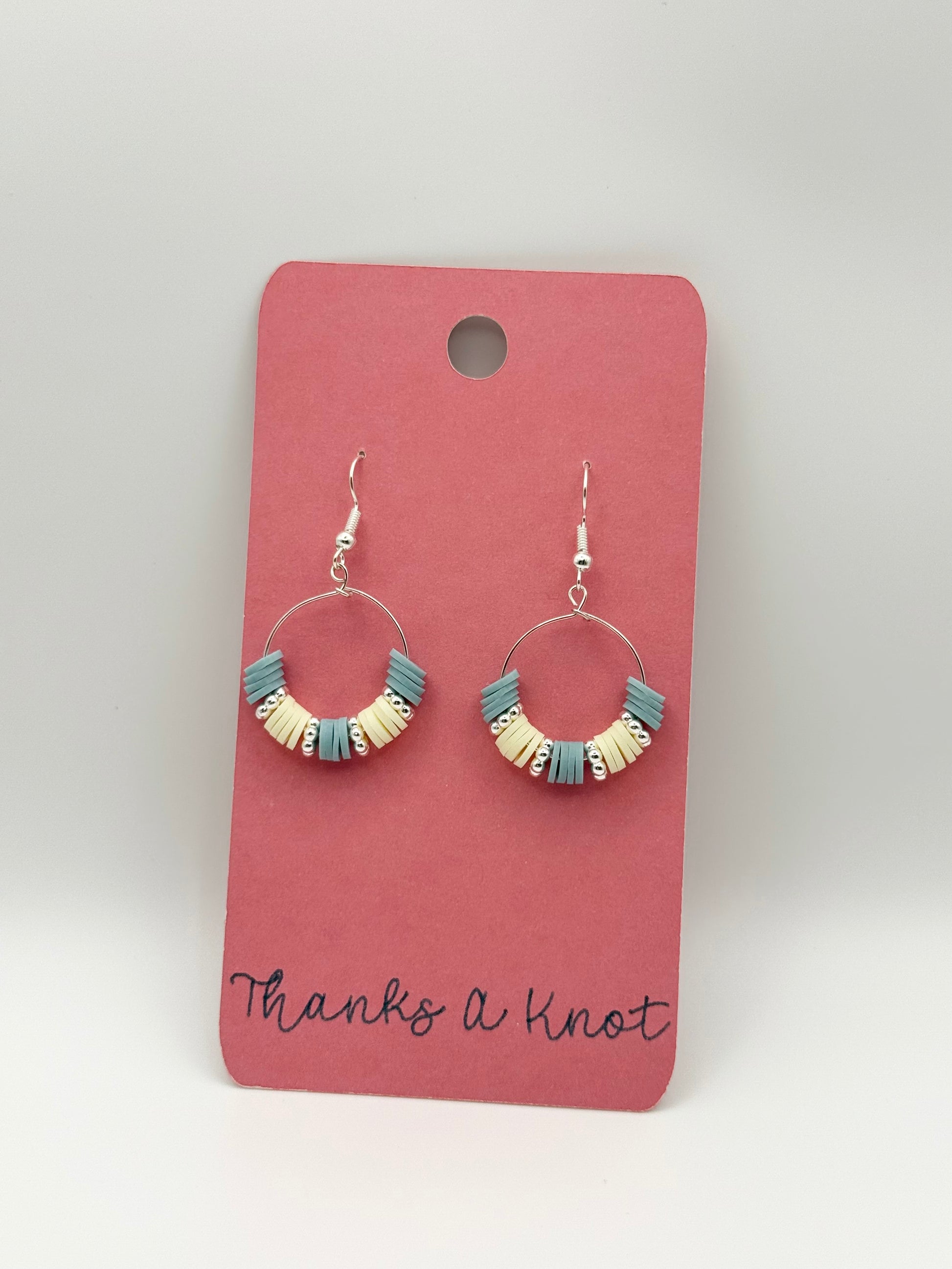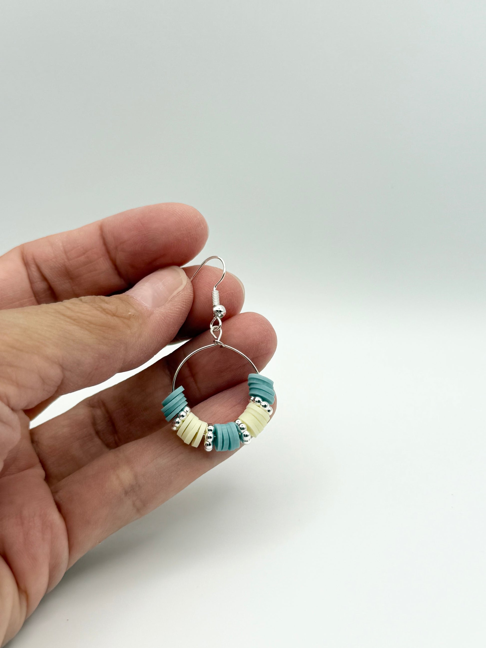 Light blue & cream heishi beads with silver flower spacer beads. Handmade silver hoops with silver findings and ear hooks. Silicone earring backs included.