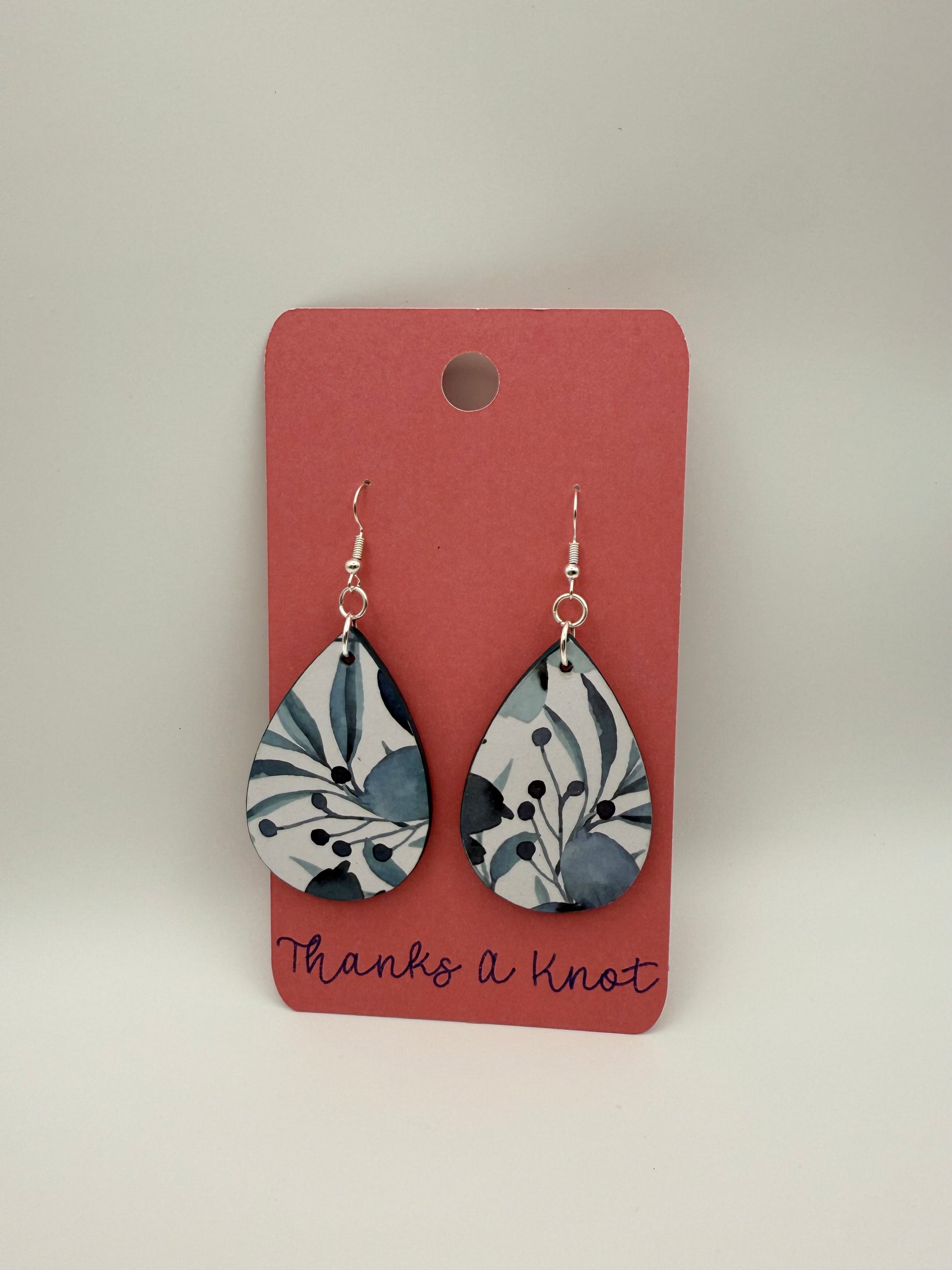 Wood and paper decoupage teardrop shaped dangle earrings. Edges are hand painted for a more finished look. Silver findings, ear hooks with silicone stoppers. Front and back design varies slightly due to nature of paper used.
