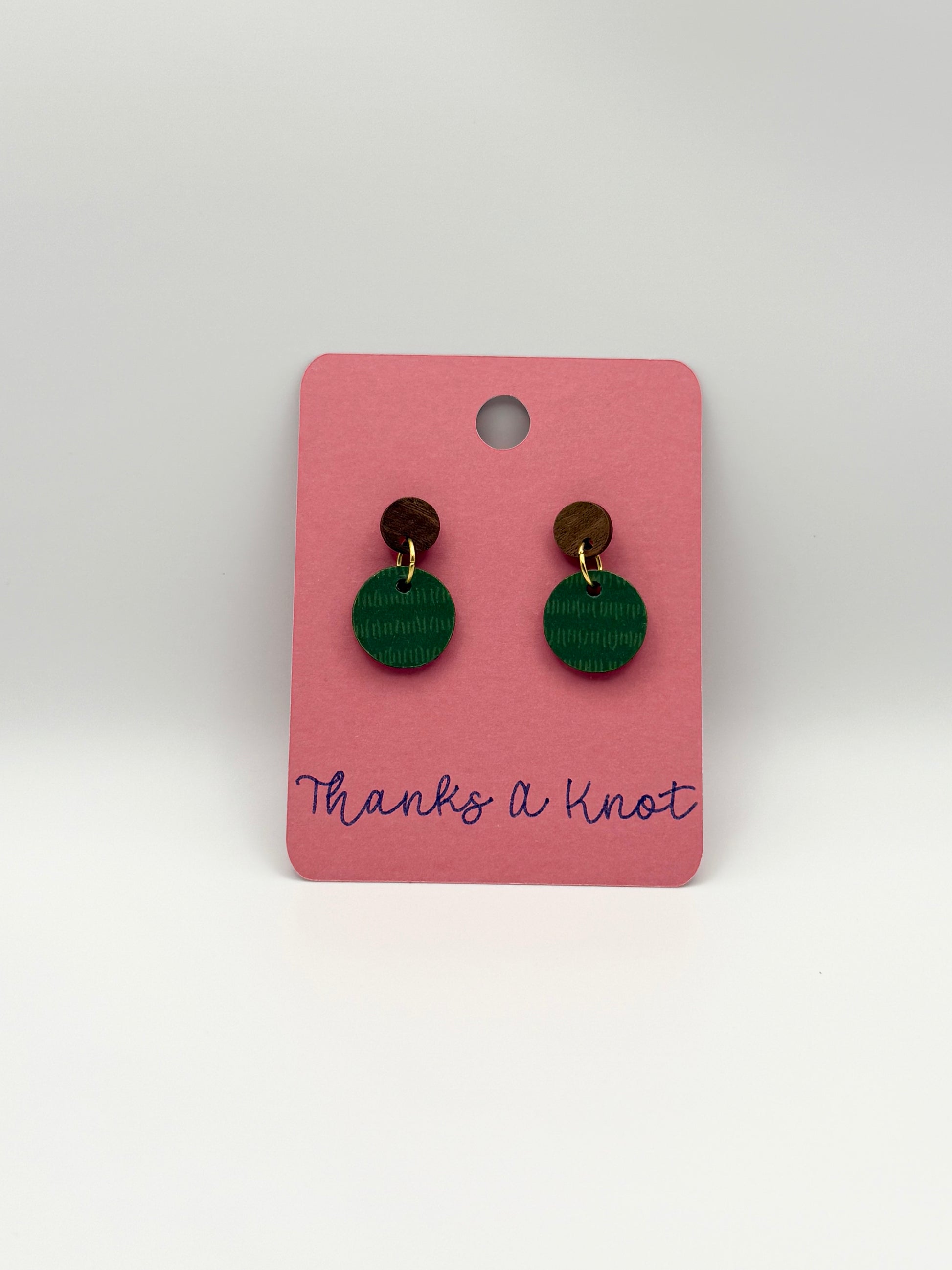 Small round wood pieces with green patterned paper decoupage. Edges and back are hand painted in a matching shade for a finished look. Gold jump rings. With silicone earring backs included.