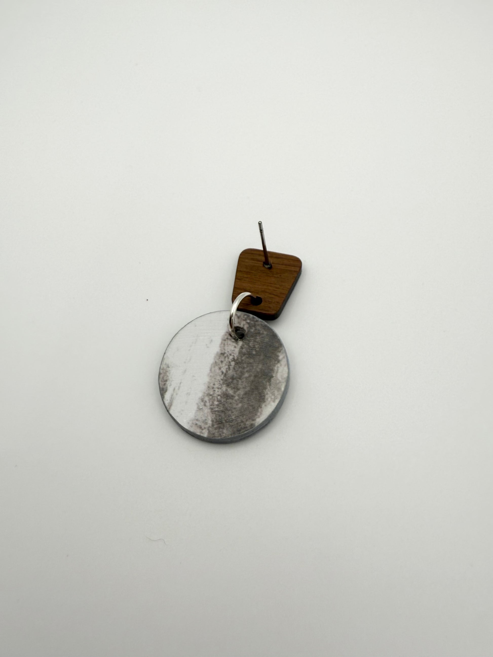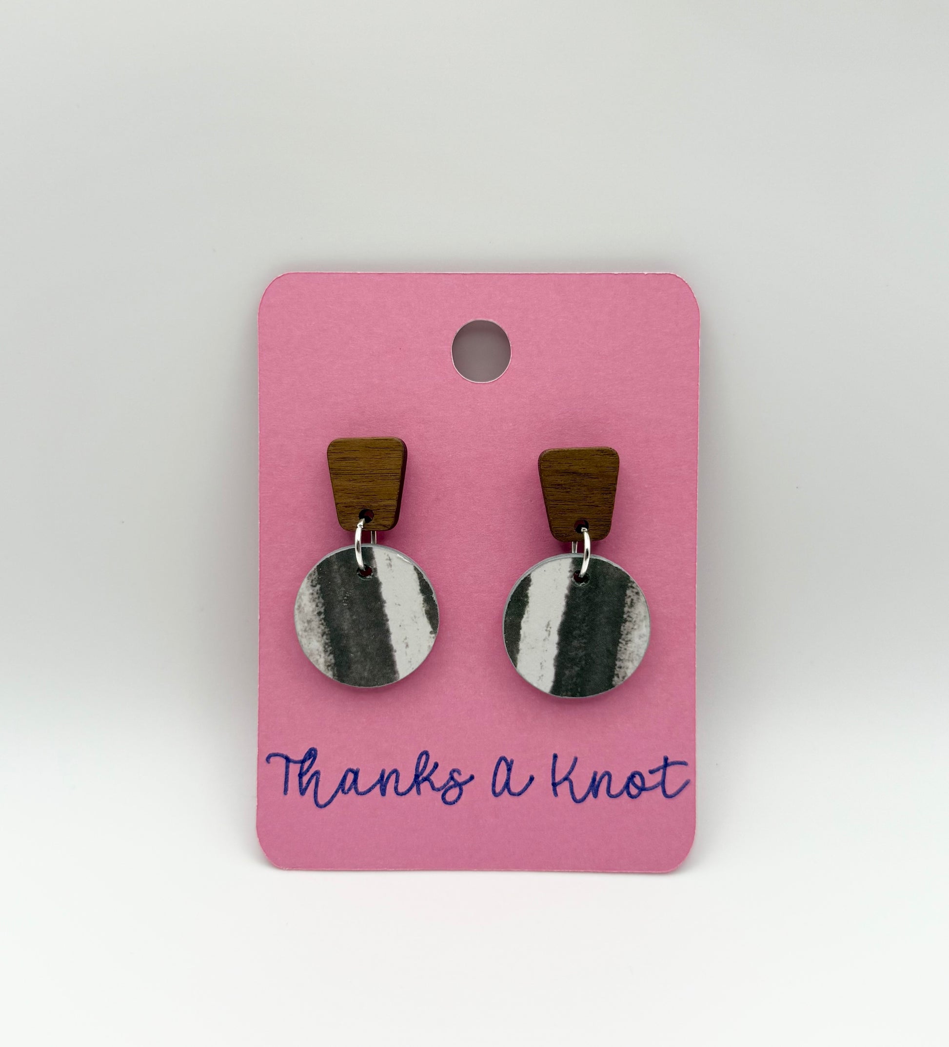 Black and white striped paper decoupage on wooden base with wood trapezoid shaped studs. Back and front differ slightly due to nature of paper used. Edges are hand painted for a more finished look. Silver jump ring. Silicone earring backs included.