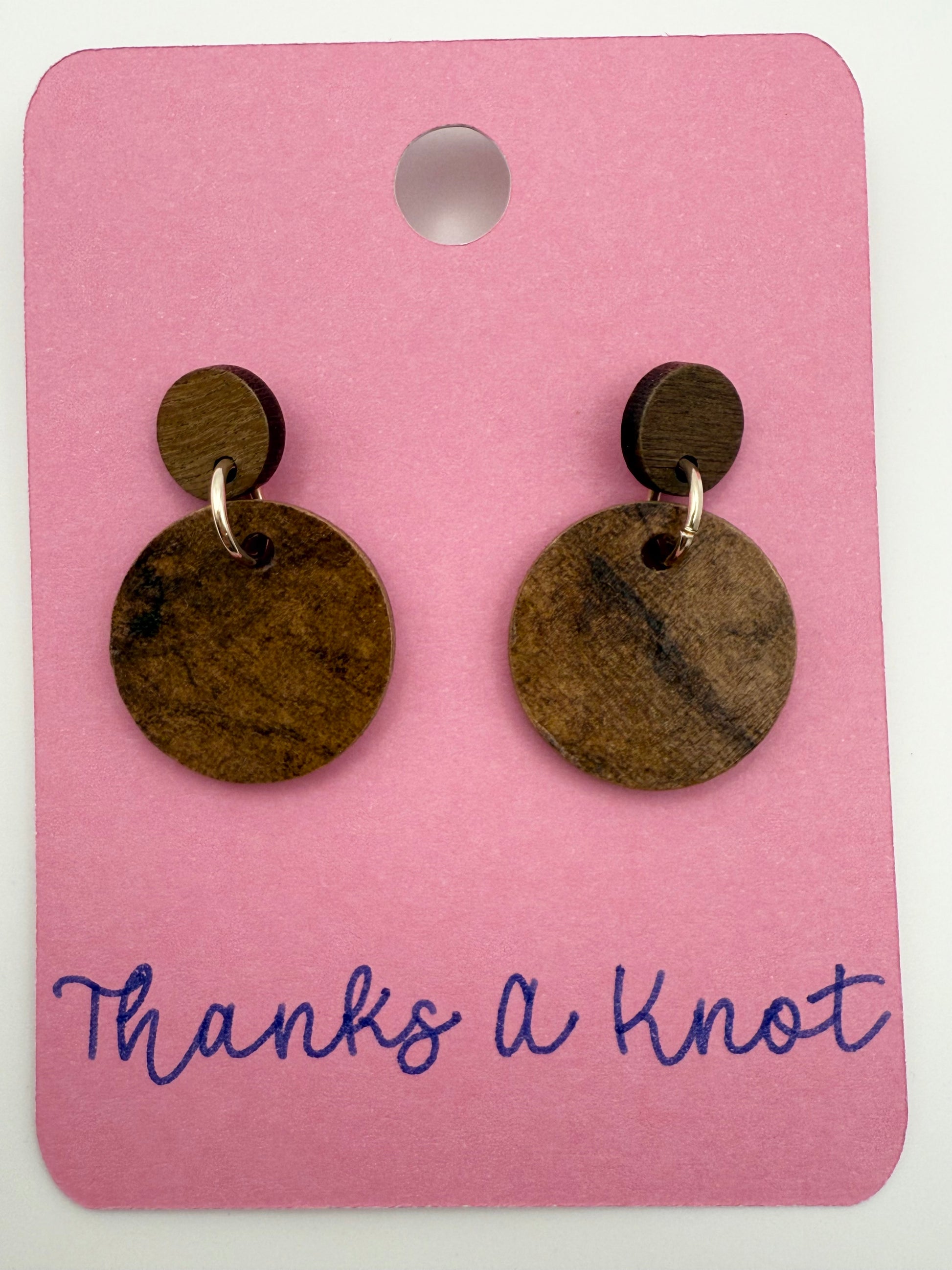Brown patterned paper decoupage and wood studs. Back and edges of earring is hand painted in a matching brown base color. Gold jump ring. Silicone earring backs included.