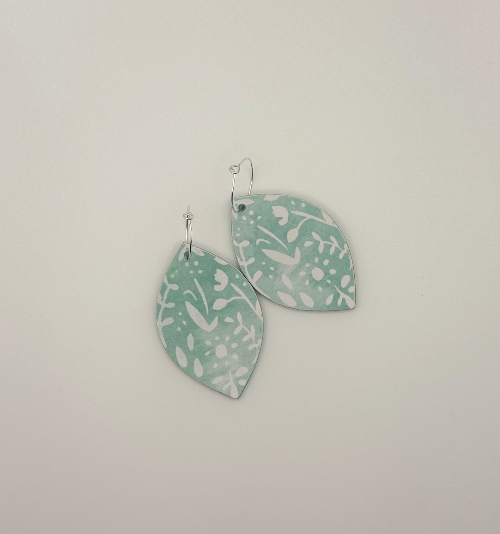 Tear drop shaped wood base with paper decoupage overlay. Silver hoops.