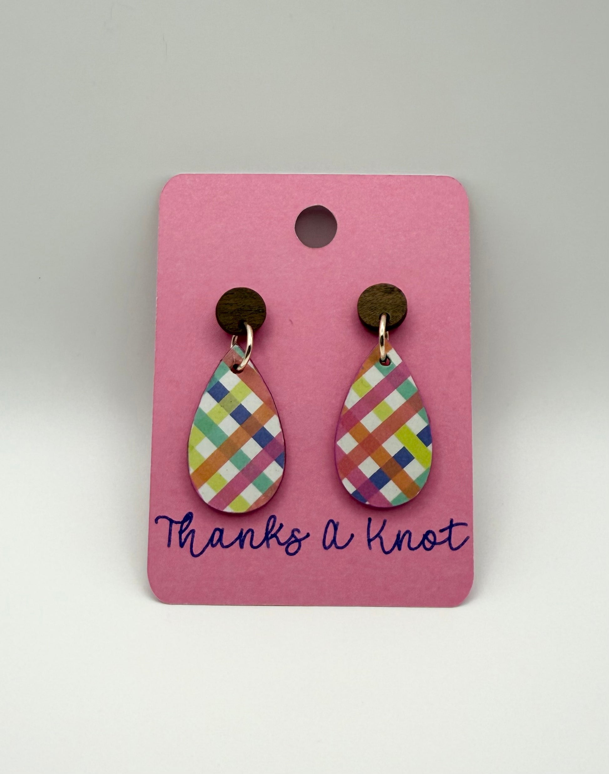 Tear drop shaped wood earrings with plaid pattern paper decoupage. Edges are hand painted in a matching shade for a finished look. Wooden circle studs are attached with rose gold jump rings. Silicone ear backs included.