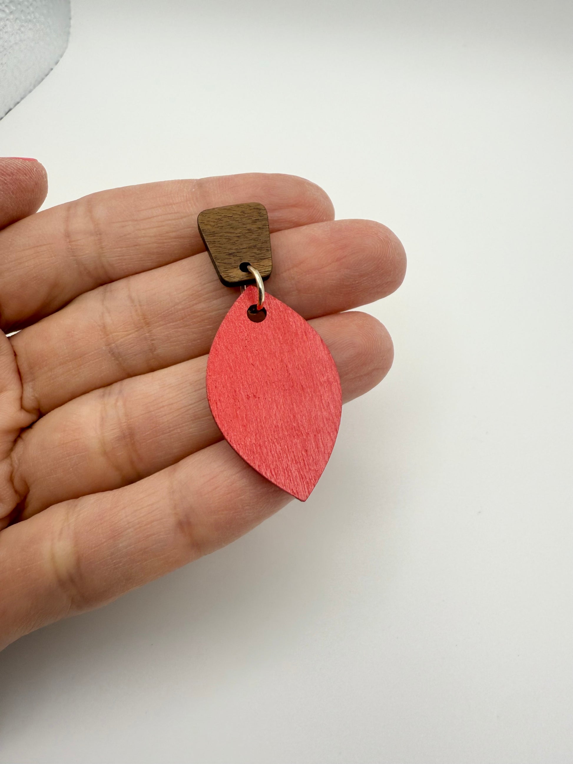 Wooden leaf shaped earrings hand painted in a coral orange shade. Sealed with acrylic paint sealer. Wooden trapezoid studs are attached with rose gold jump rings. Silicone ear backs included.